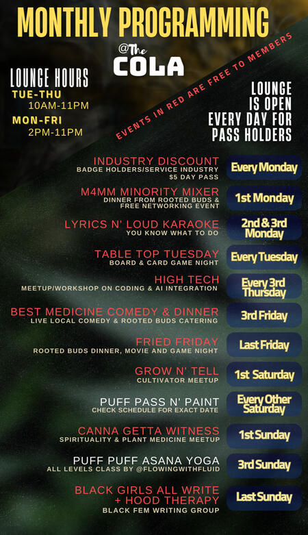 The Cola Lounge is a private, members only space where buds can feel at home, learn and have fun while they safely enjoy the plant.